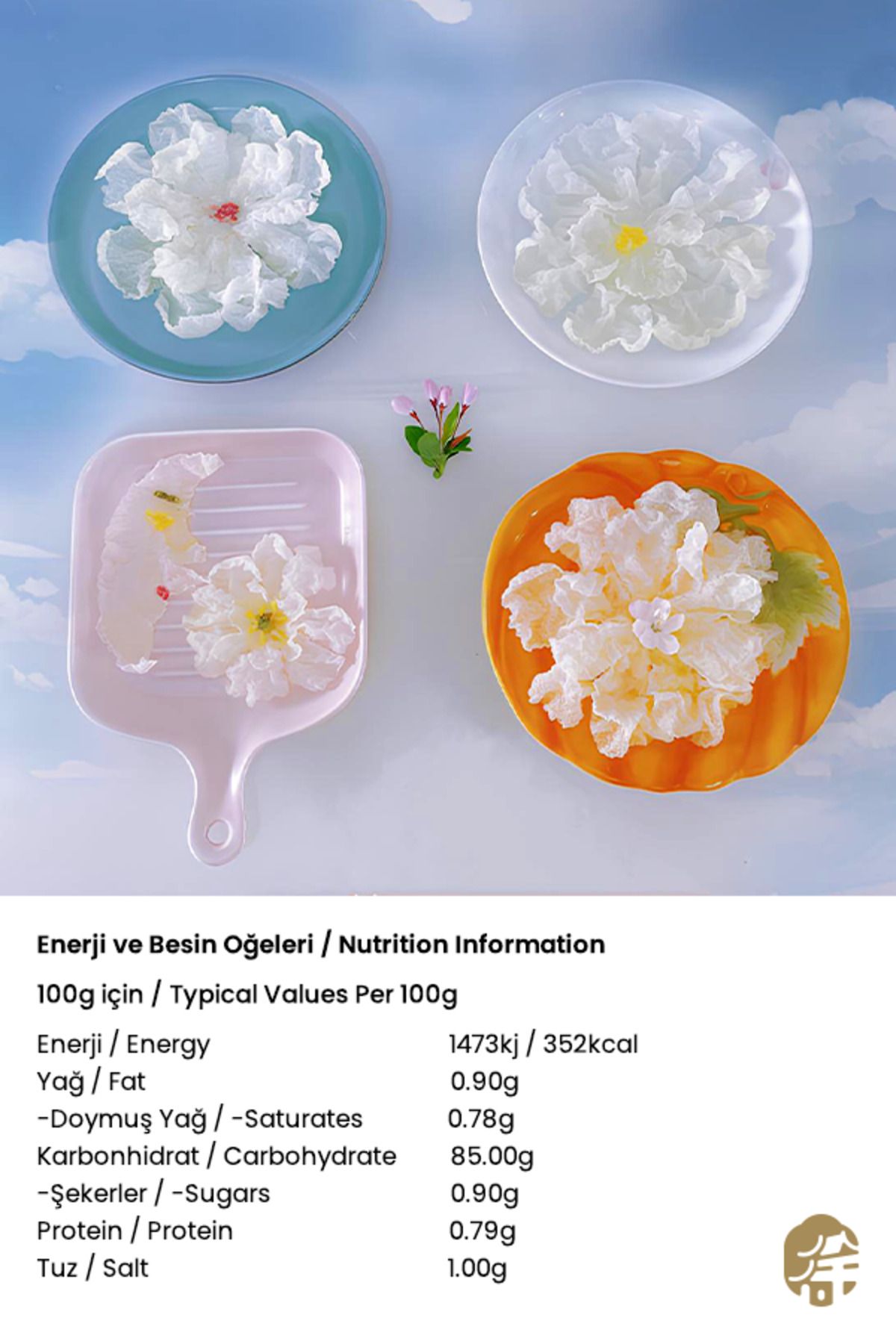 İçindekiler: Tapyoka Nişastası 76%, Pirinç 10% ,Su ,Tuz Net Miktar: 400gr Menşei: Vietnam Nutrition Information Enerji ve Besin Öğeleri (Typical Values Per 100g) 100g için Enerji/ Energy 1473kj/ 352kcal Yağ / Fat 0; 9g; Doymuş Yağ/ Saturated Fat 0; 78g Karbonhidrat/ Carbohydrate 85g Şekerler/Sugar 0; 9g Protein/Protein 0; 79g Tuz/Salt 1; 0g;